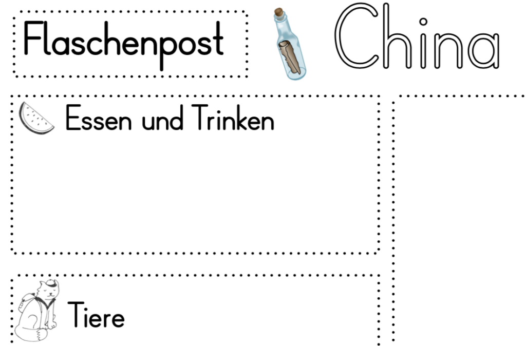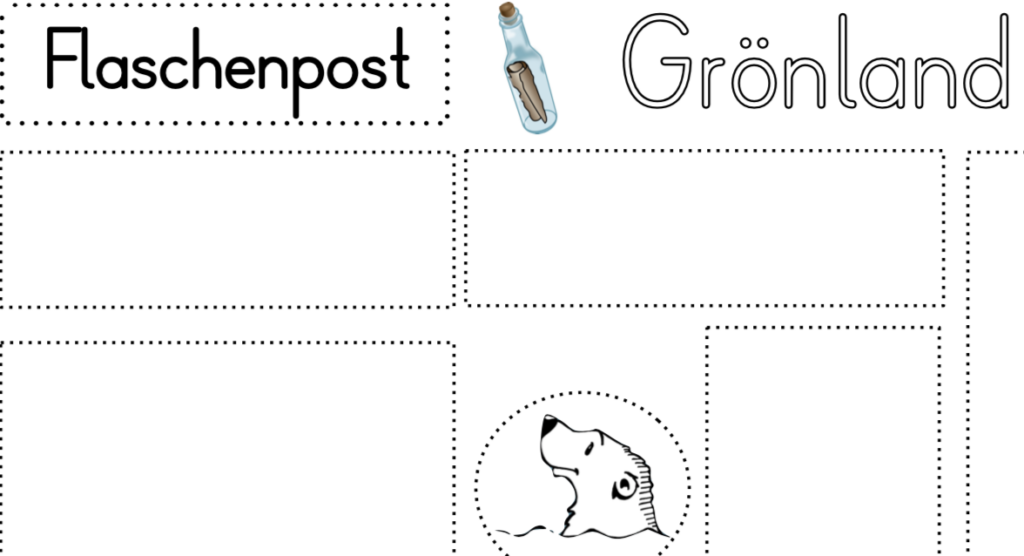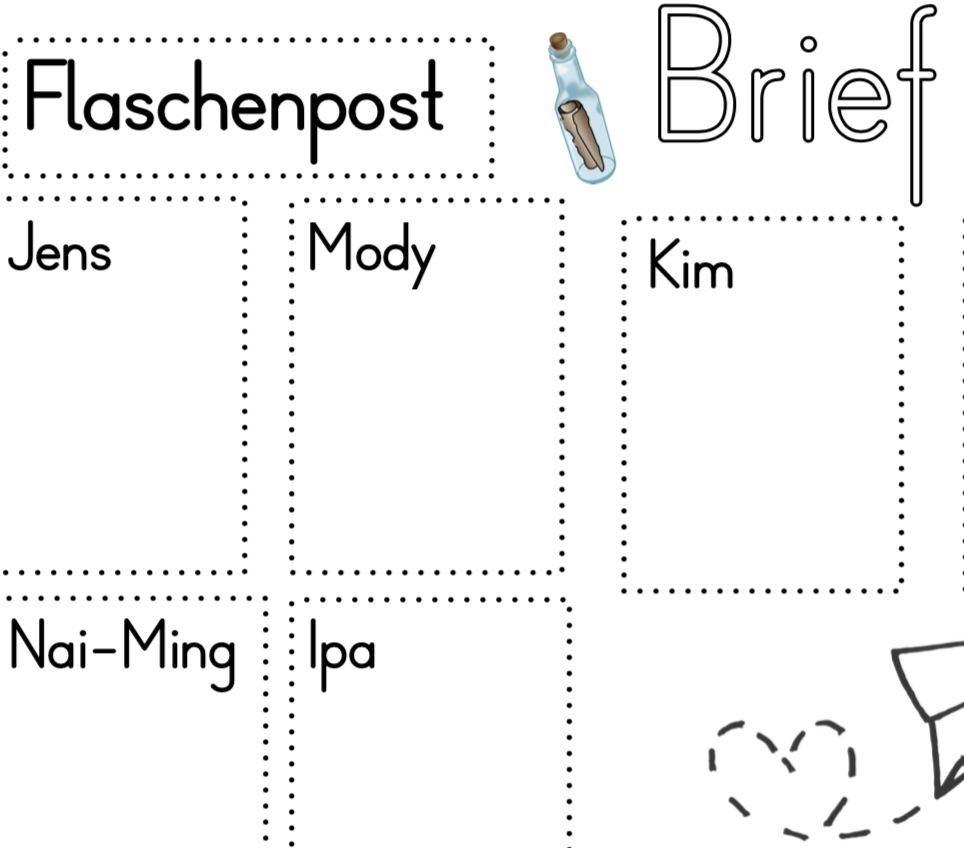 Das Buch „Flaschenpost, schwimm übers Meer“ von Lore Leher und Astrid Krömer war mein Aufhänger zu dieser Unterrichtsreihe. Die Geschichte im Bilderbuch wird in Reimform erzählt und beginnt in Dänemark. Jens ist einsam und sucht einen Freund. Deshalb schickt er eine Flaschenpost mit seinem Bild und der Frage „Wer will mein Freund sein?“ auf die Reise. Die Flaschenpost landet zu erst in Afrika /Madagaskar, schwimmt weiter nach Indien, China, Mexiko und Grönland und landet am Schluss wieder bei Jens. Jedes Kind, welches die Flasche fand, malte sich dazu und so hatte er am Schluss Freunde aus aller Welt gefunden.