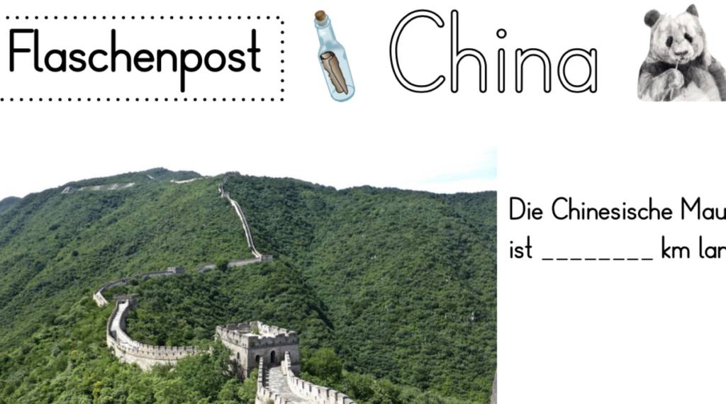 Einführung die Vierte: die Kinder waren begeistert, als eine neue Einführung im Sitzkreis lag, die Reise ging weiter und es wurde schon vor Stundenbeginn wild im Sitzkreis diskutiert 🙂 Wir haben die Chinesische Mauer, die Schriftzeichen und als Tier, den Panda genauer betrachtet.