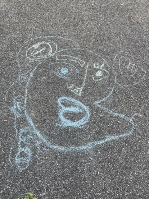 Begonnen haben wir in Partnerarbeit auf dem Pausenhof. Die Kinder haben im Wechsel gewürfelt und gemeinsam ein grosses Porträt mit Kreide gemalt.