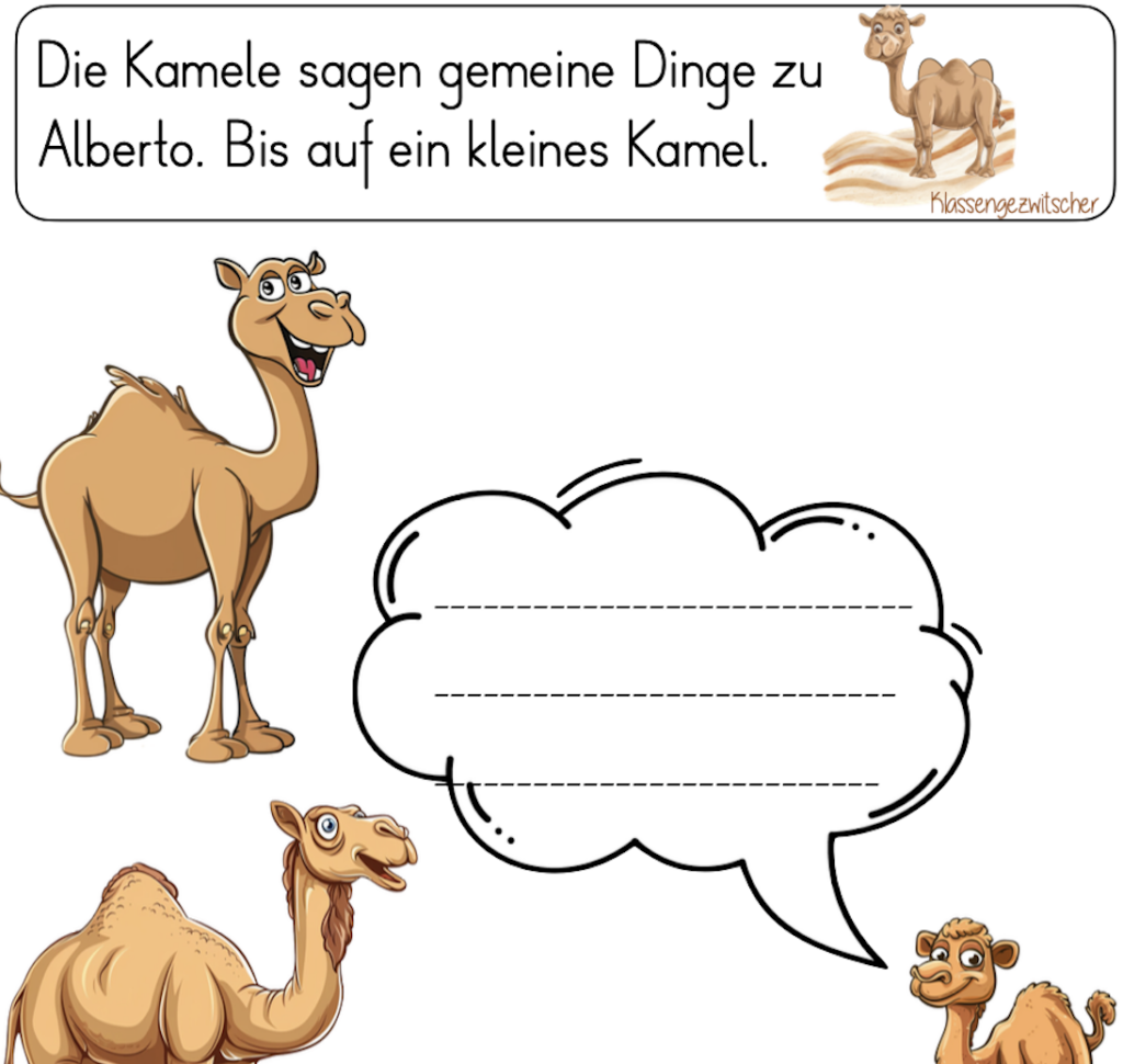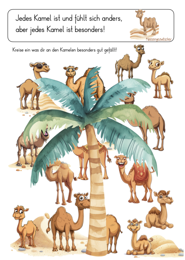 Die Arbeitsblätter zum Bilderbuch greifen die Geschichte direkt auf, sie können nacheinander oder zeitgleich mit dem Vorlesen der Geschichte, bearbeitet werden. Im Material gibt 10 Arbeitsblätter, ein Deckblatt für das Schüler-Dossier plus Lösungsblätter. Du findest es bei eduki unter Klassengezwitscher. Für das Bilderbuch und das herzige Kamel findest du auf meiner Seite der Lieblingsartikel unter Safari in Afrika und Giraffensprache einen externen Link. Das Material zum Buch findest du hier: