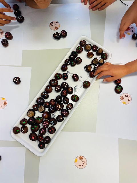 Eine herbstliche Übung zur Zahlzerlegung im Zahlenraum 12. Im ersten Schritt sollten die Kinder Möglichkeiten mit zwei Kastanien finden…..sehr schnell kam der Wunsch mehr Kastanien bei der Zerlegung der Zahlen zu benützen.. Die Punkte habe ich mit Acrylstiften auf die Kastanien gemalt, deshalb leuchten sie so schön 🙂