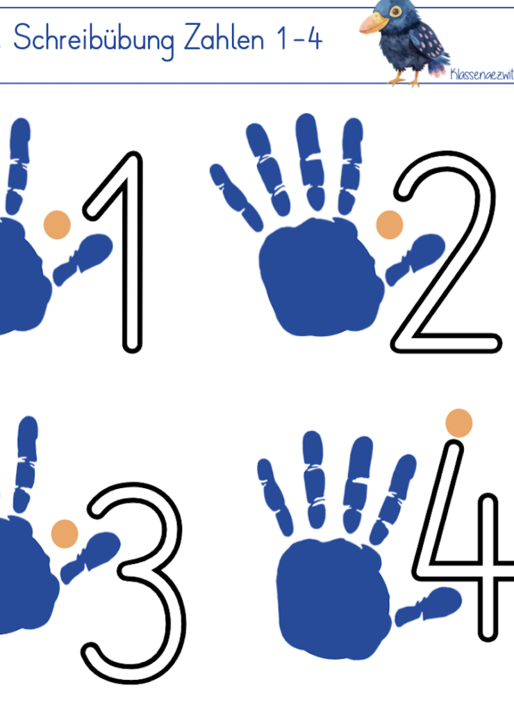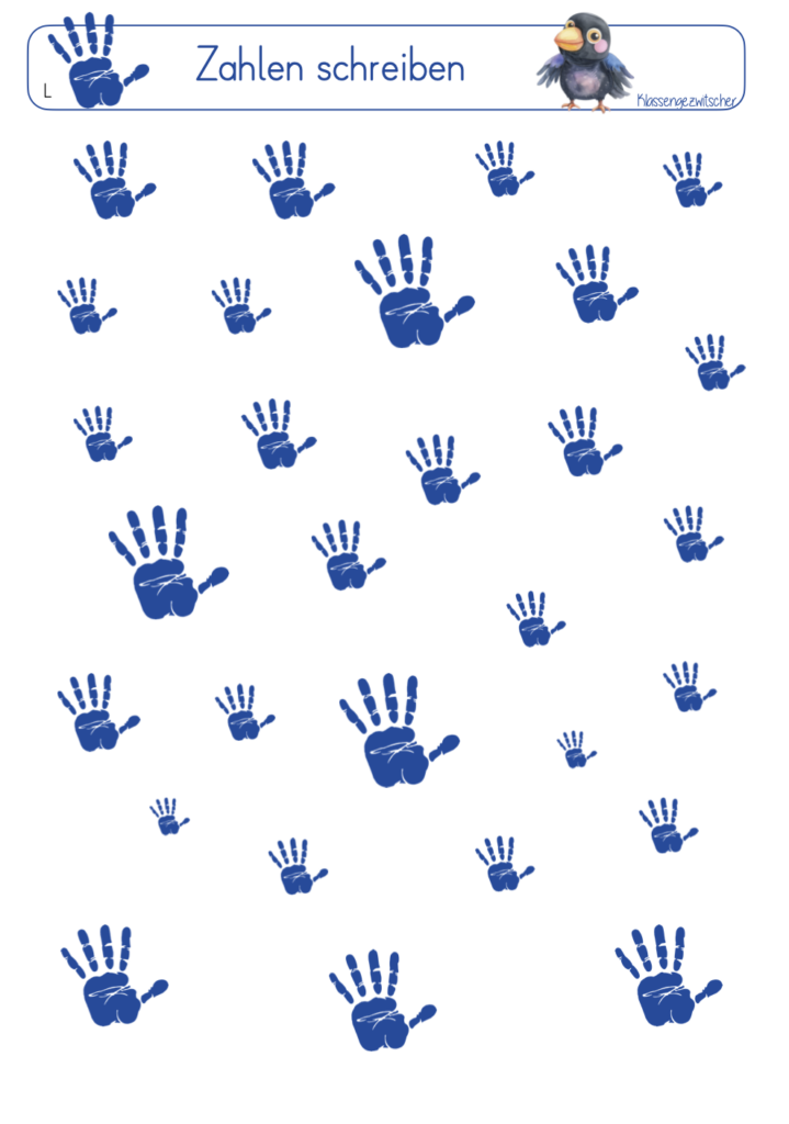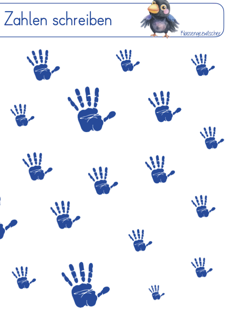 Als Tafelmaterial zur Einführung, aber auch als Wiederholung eignen sie sich wunderbar um sich an den Schreibverlauf der Zahlen zu erinnern. Statt den Handsymbolen kann man den eigenen Handabdruck auf die Tafel drucken. Leider trocknen dieser recht schnell, aber eine lustige Alternative ist es auf jeden Fall. Da sowohl Links-als auch Rechtshänder diese Schwäche haben können, sind die Materialien unterschiedlich gestaltet. Bei den Rechtshändern sieht man die linke Hand von oben. Bei den Linkshändern die rechte Hand von innen. Die AB sind zusätzlich mit rechts und links beschriftet.