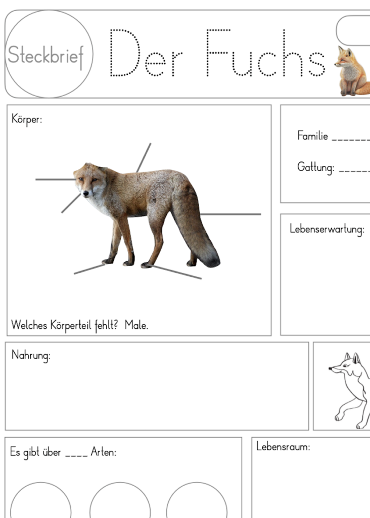 Auch der Steckbrief zum Fuchs hat seinen Platz im Infocube gefunden. Wir haben ihn zum Schluss bearbeiten, die Kinder sollten ihn möglichst selbstständig lösen können. Als Hilfe gab es für die 1. Klasse ein Arbeitsblatt mit Lösungshilfen zum Ausschneiden oder abschreiben. Die 2. Klasse konnte bei Unsicherheit die Informationen auf der Webseite zum Rotfuchs nachlesen. Im Material gibt es auch ein Lösungsblatt. Den Steckbrief findest du auf eduki unter Klassengezwitscher.