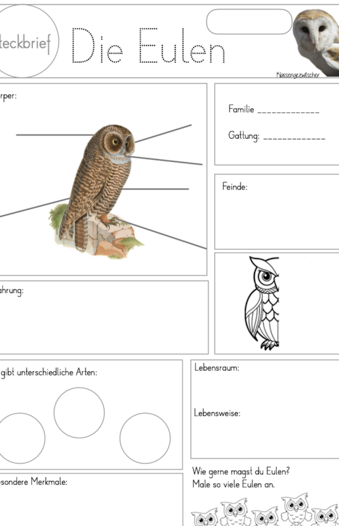 Mit dem Steckbrief zur Eule haben wir diese lautlosen Jäger des Waldes behandelt. Die Kinder konnten ihre Informationen über die Seite im Internet beziehen oder mit der Lösungshilfe arbeiten.
