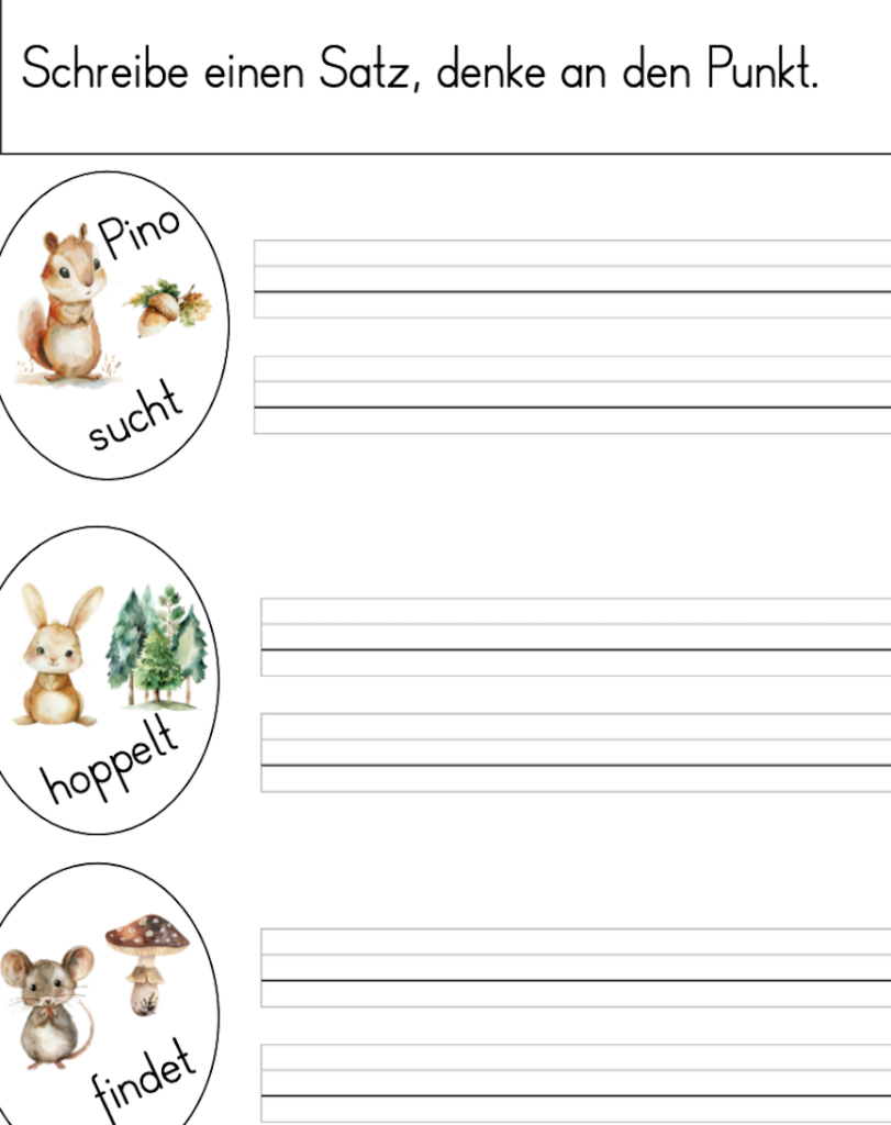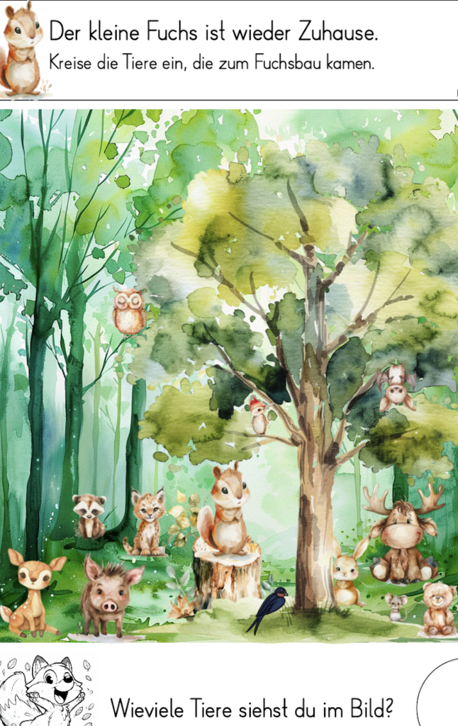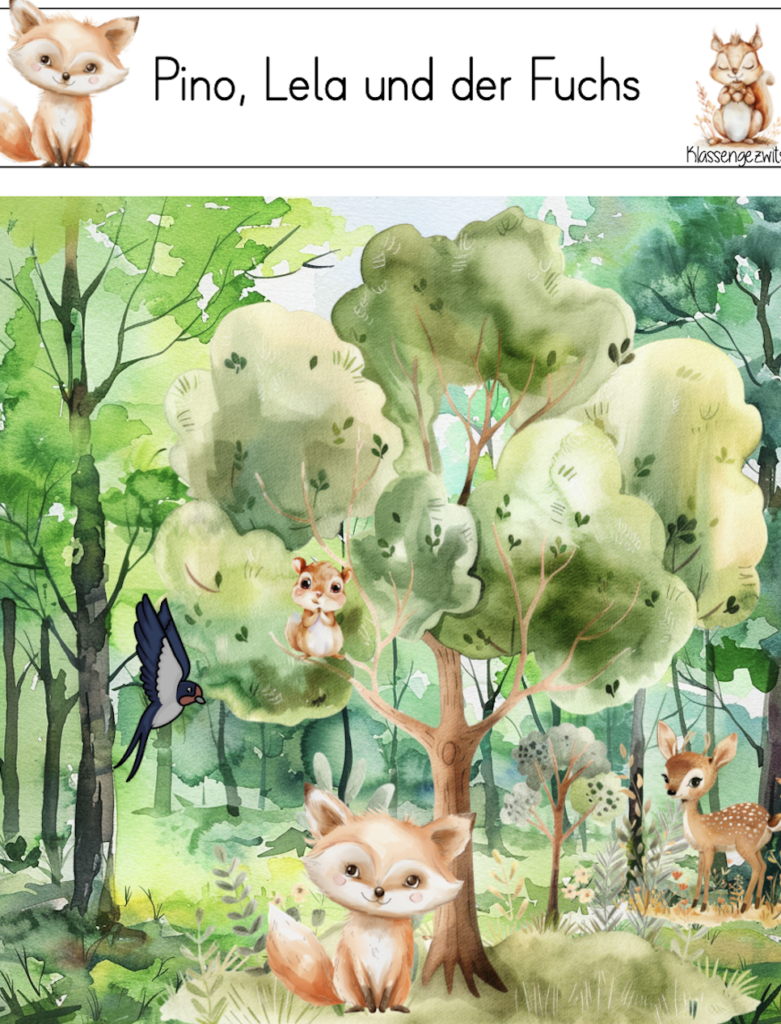 Das Bilderbuch „Pino und Lela und der kleine Fuchs“ von Günther Jakobs habe ich als Einstieg zu den Waldtieren verwendet. Das Bilderbuch wurde den Kinder im Plenum vorgelesen. In der Geschichte findet die Schwalbe Lela einen kleinen Fuchs, der sich im Wald verlaufen hat. Pino und Lela fragen unterschiedliche Tierarten im Wald, ob sie bei der Suche helfen könnten. Zuerst die Eule, dann die Rehe, die Hasen, das Wildschwein und ganz zuletzt den Dachs. Dieser weiss genau wo die Fuchsfamilie lebt, da auch er in einem Bau in der Nähe wohnt. Die Geschichte endet ganz klar mit einem Happyend. Der kleine Fuchs schläft nach dem überstandenen Abenteuer glücklich im Rudelknäul ein. Die einfachen Aufgaben zu diesem Buch, habe ich für beide Klassen erstellt. Die Kinder haben ein geheftetes Dossier erhalten und bearbeiten die Arbeitsblätter der Reihe nach und selbstständig. Vier der ingesamt neun Arbeitsblätter habe ich unten als Beispiel aufgeführt.