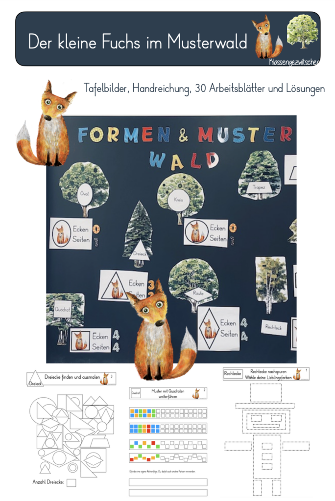 Der kleine Fuchs verirrt sich im Wald der Formen-und Muster. Immer wieder steht er vor einem neuen Baum und kann sich nicht erklären, was für Formen im Baum hängen. Die Kinder begleiten den Fuchs auf seiner Reise durch den Wald. Die weissen Formen helfen den Kindern die richtige Form den Bäumen zuzuordnen und werden jeweils an den entsprechenden Baum gehängt. Im Anschluss werden Ecken und Seiten gezählt und ebenfalls an der Tafel notiert. Die AB zu der jeweiligen Form können die Kinder nach der einmaligen Einführung selbständig lösen und mit den Lösungsblättern vergleichen.